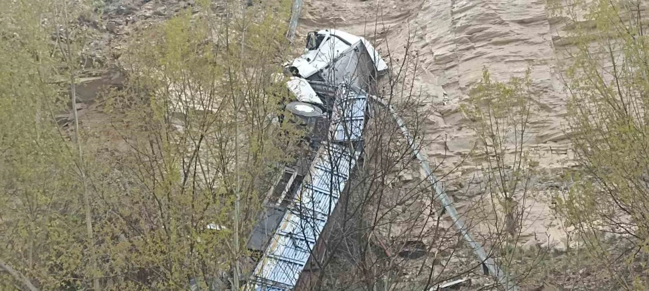 Sivas’ta metrelerce yükseklikten uçuruma düşen tırın sürücüsü kazayı hafif sıyrıklarla atlattı.