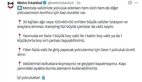 Metro İstanbul’un sosyal medya hesabından yapılan açıklamada, 30 kilogramdan ağır veya belli ebatlardan büyük valizlerin istasyon ve araçlara alınmayacağı buna ek olarak 1’den fazla valiz ile giriş yapacak yolculardan ilave 1 yolculuk ücreti alınacağı belirtildi.