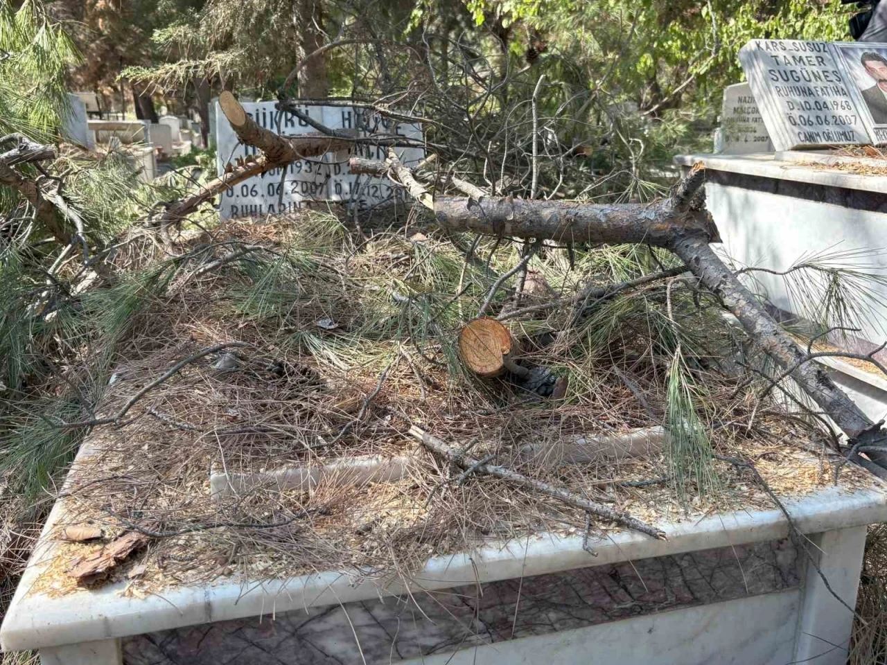 İzmir’in Buca ilçesindeki Kaynaklar Mezarlığı’nda yapılan ağaç budama çalışmaları sırasında, kontrolsüz bir şekilde kesilen dallar bazı mezarlara zarar verdi.