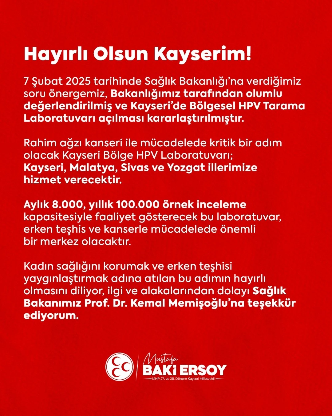 ’Hayırlı Olsun Kayserim’ diyerek müjdeyi duyuran MHP Kayseri Milletvekili Baki Ersoy; "7 Şubat 2025 tarihinde Sağlık Bakanlığı’na verdiğimiz soru önergemiz, bakanlığımız tarafından olumlu değerlendirilmiş ve Kayseri’de Bölgesel HPV Tarama Laboratuvarı açılması kararlaştırılmıştır. Rahim ağzı kanseri ile mücadelede kritik bir adım olacak Kayseri Bölge HPV Laboratuvarı; Kayseri, Malatya, Sivas ve Yozgat illerimize hizmet verecektir. Aylık 8 bin, yıllık 100 bin örnek inceleme kapasitesiyle faaliyet gösterecek bu laboratuvar, erken teşhis ve kanserle mücadelede önemli bir merkez olacaktır. Kadın sağlığını korumak ve erken teşhisi yaygınlaştırmak adına atılan bu adımın hayırlı olmasını diliyor, ilgi ve alakalarından dolayı Sağlık Bakanımız Prof. Dr. Kemal Memişoğlu’na teşekkür ediyorum" dedi.