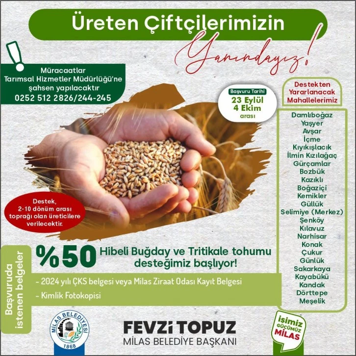 Milas Belediyesi Tarımsal Hizmetler Müdürlüğü tarafından hayata geçirilen proje kapsamında, belirlenen mahallelerde başvuru şartlarına uyan çiftçilerimize yönelik yüzde 50 hibeli buğday ve tritikale tohum desteği sağlanacak.