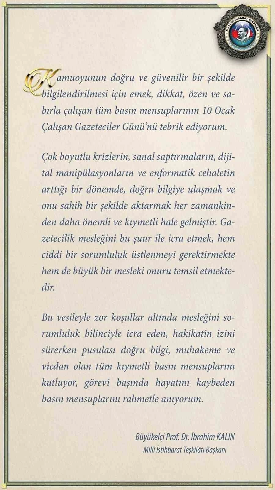 MİT Başkanı İbrahim Kalın, kamuoyunun doğru ve güvenilir bir şekilde bilgilendirilmesi için emek, dikkat, özen ve sabırla çalışan tüm basın mensuplarının 10 Ocak Çalışan Gazeteciler Günü’nü tebrik ederek şu ifadelere yer verdi: