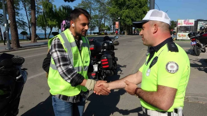 Ordu’da trafik polisleri, şehirdeki uygulama noktalarında motosiklet sürücülerine yönelik bilgilendirici trafik denetimi düzenledi. Denetimlerde yaklaşık 100 motosiklet sürücüsüne reflektörlü yelek dağıtıldı.