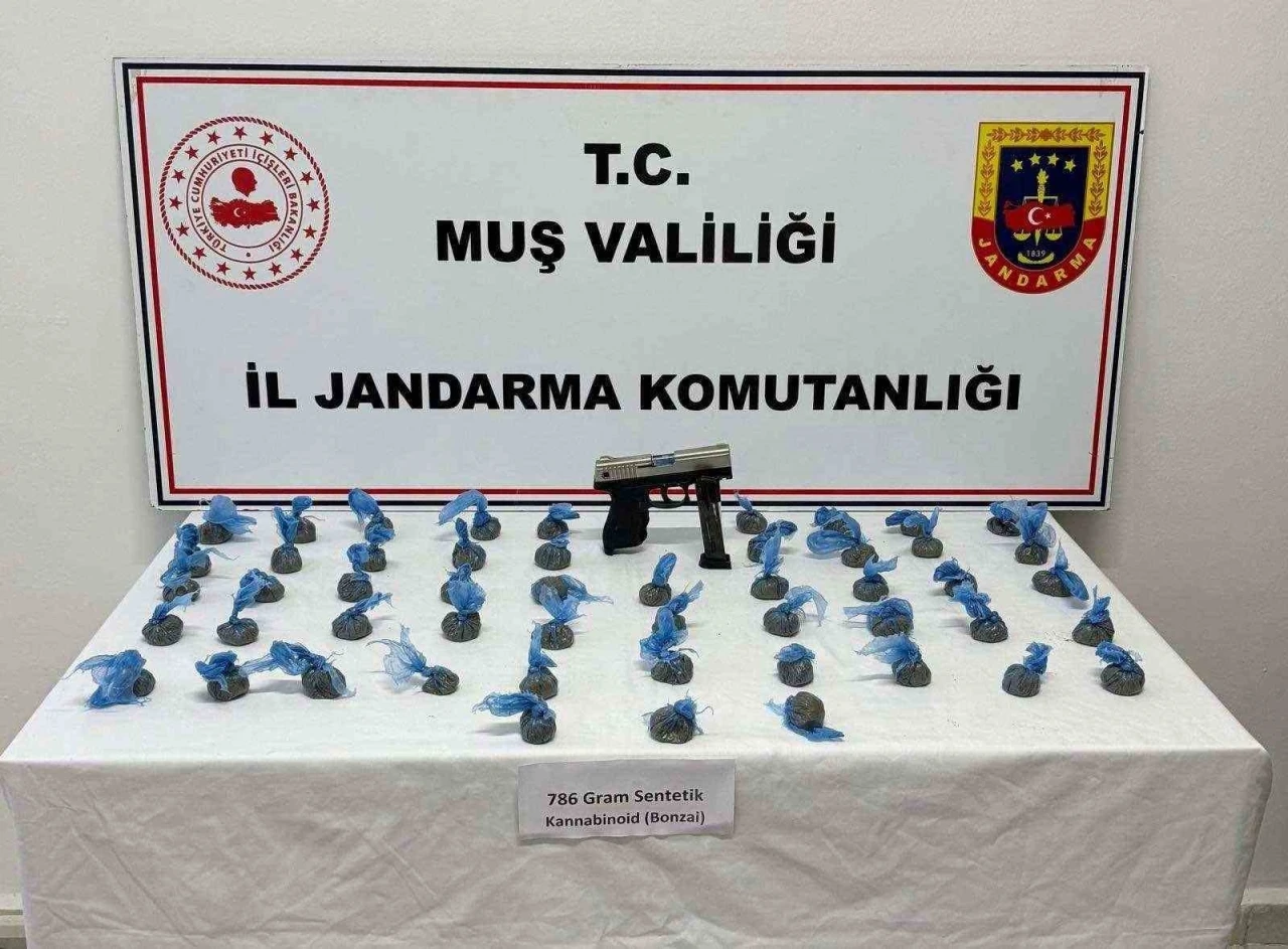 Valilikten yapılan açıklamada, Muş İl Jandarma Komutanlığı unsurlarınca yapılan araştırmada Y.E.Ş. isimli şahsın uyuşturucu madde satışı yaptığı ve bu uyuşturucu maddeleri il merkezinde bulunan iş yerinde sakladığı bilgisi elde edildiği belirtildi. Açıklamada, “Elde edilen bilgiler ışığında Muş Cumhuriyet Başsavcılığından alınan arama kararına istinaden icra edilen arama faaliyetinde; Y.E.Ş. isimli şahsın üzerinde satışa hazır halde 7 parça, iş yerinde 44 parça olmak üzere toplam ağırlığı 786 gram gelen 51 parça sentetik kannobinoid (Bonzai), 1 adet ruhsatsız tabanca ve bu tabancaya ait 1 adet şarjör ele geçirilmiştir. Muş Cumhuriyet Savcısının talimatı doğrultusunda şüpheli Y.E.Ş. isimli şahıs gözaltına alınmış, ele geçirilen uyuşturucu maddelere ve tabancaya el konulmuştur” denildi.
