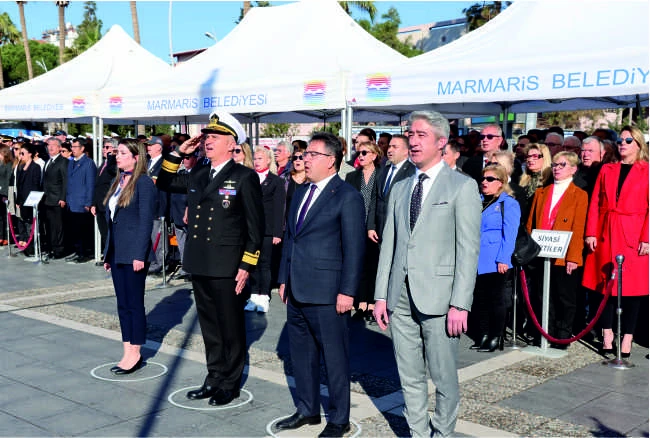 Marmaris’in onur günü kutlamaları Ata’nın huzuruna çelenk sunumu ile başladı. Daha sonra saygı duruşunda bulunuldu ve İstiklal Marşı okundu. Pİ Koleji Müdür Yardımcısı Burcu Arıcı günün anlam ve önemine ilişkin konuşma yaptı. Konuşmanın ardından Mustafa Kemal Atatürk’ün ilçeye gelişinin temsili canlandırılması yapıldı. Kırmızı – beyaza bürünmüş onlarca gemi sirenler eşliğinde deniz üstünde geçit yaptı.