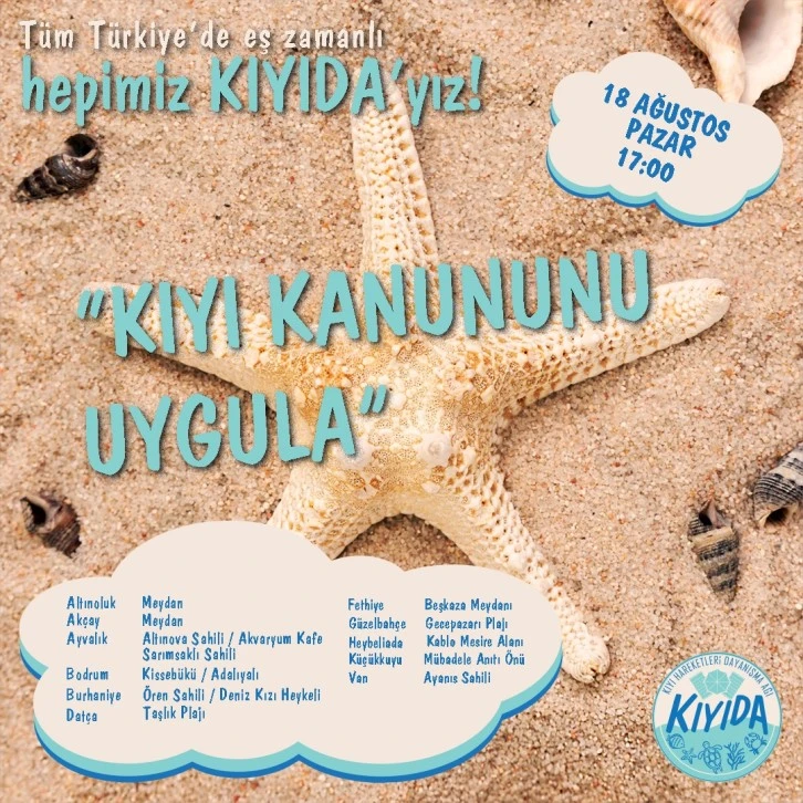 Ülke genelinde bazı kıyıların vatandaşlara kapatılarak özel plaj yapılmasına karşı uzun zamandır yerel olarak sürdürülen eylemler ülke geneline yayılıyor. “Kıyı Hareketleri Dayanışma Ağı KIYIDA” harekatı tarafından 18 Ağustos Pazar günü saat 17’de çok sayıda il ve ilçede eş zamanlı olarak “Hepimiz KIYIDA'yız, Kıyı Kanununu uygula” eylemi gerçekleştirilecek.