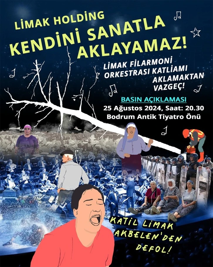 Muğla’nın Milas ilçesinde bölgenin yaşam ve su kaynağı Akbelen Ormanı’nın katledilmesinden sonra hızla devam eden maden çalışmalarında patlatılan dinamitler köylünün can güvenliğini tehdit ederken, “Limak Filarmoni Orkestrası’nın Bodrum’da vereceği konsere çevreciler karşı çıktı. Yapılan açıklamayla, “Sanki doğa katliamı yapan onlar değilmiş gibi suyunu çaldıkları ilçelerden Bodrum’da verecekleri “Limak Filarmoni Orkestrası” konserine sessiz kalmayacağız” denildi.