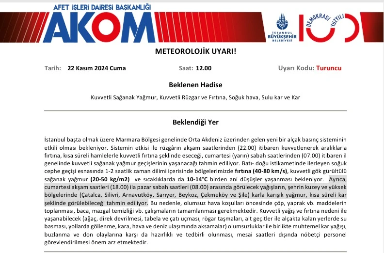 Cumartesi(Bugün) akşamından pazar sabahına kadar (18.00-08.00) devam etmesi öngörülen yağışların, İstanbul’un kuzey ve yüksek bölgelerinde (Çatalca, Silivri, Arnavutköy, Sarıyer, Beykoz, Çekmeköy ve Şile) karla karışık yağmur ve kısa süreli kar şeklinde görülebileceği tahmin ediliyor.
