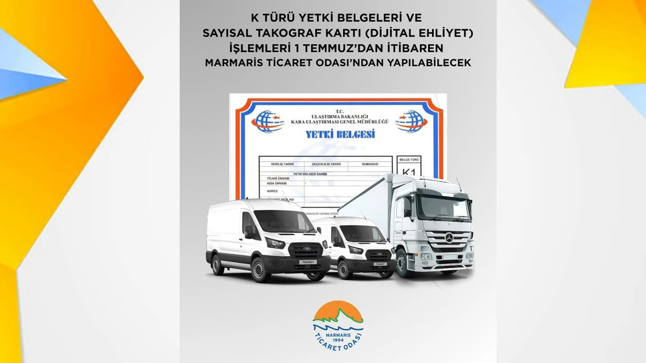 Ticari amaçla yurtiçi eşya taşımacılığı yapan, kendi adına ticari veya hususi olarak kayıt ve tescil edilmiş taşıtla sadece kendi esas iştigal konusu ile ilgili eşya taşımacılığı yapan veya ticari amaçla yurtiçi ev ve büro eşyası taşımacılığı yapan gerçek ve tüzel vergi mükelleflerinin alması zorunlu K Türü Yetki Belgeleri ile karayolu ile yolcu ve eşya taşımacılığı yapan ticari araçlar için zorunlu Sayısal Takograf Kartı (Dijital Ehliyet) işlemleri 1 Temmuz’dan itibaren Marmaris Ticaret Odası’ndan yapılabilecek.