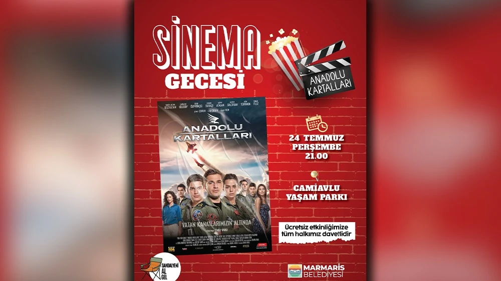 Marmaris Belediyesi, sıcak yaz akşamlarını sinema ile renklendirecek. Sinemanın en güzel örnekleri, Camiavlu Yaşam Park Kafe’de perdeye yansıtılacak. Marmaris Belediyesi Sinema Gecesi, 24 Temmuz Perşembe günü gerçekleştirilecek. Saat 21.00’de başlayacak ücretsiz etkinlikte ilk olarak Anadolu Kartalları isimli film gösterilecek.