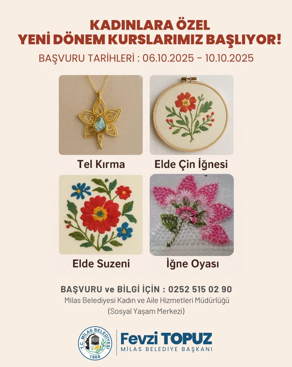 Milas Belediyesi Sosyal Yaşam Merkezi’nde ücretsiz olarak gerçekleştirilecek olan iğne oyası, elde çin iğnesi, elde suzeni ve tel kırma yapımı kurslarına başvurular 6 Ekim Pazartesi günü başlayıp 10 Ekim Cuma günü son bulacak.