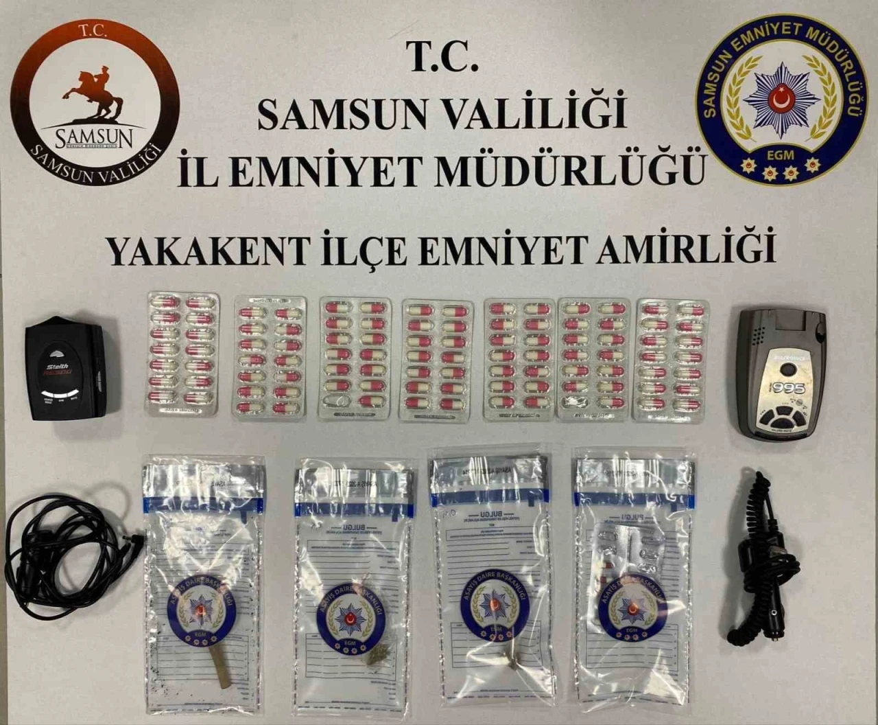 İl Emniyet Müdürlüğü Yakakent İlçe Emniyet Amirliği ekiplerince gerçekleştirilen Narko Alan uygulamasında 4 araç üzerinde yapılan aramalarda uyuşturucu madde ve çeşitli cihazlar ele geçirildi. Yapılan kontroller sonucunda toplamda 101 adet sentetik ecza, 0,4 gram kenevir tohumu, 0,5 gram skunk, 1 adet esrarlı sigara ve 2 adet radar tespit cihazı ele geçirildi.