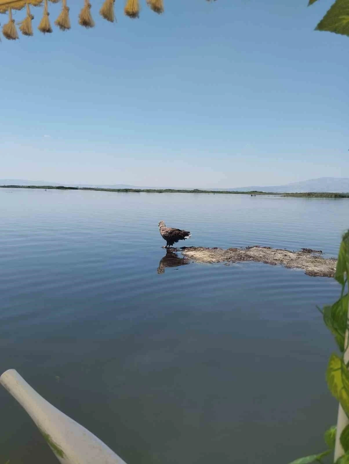 Nesli tükenme tehlikesi altındaki Ak Kuyruklu Kartal, birçok canlıya ev sahipliği yapan Işıklı Gölünde tekne turu yapanlar tarafından görüldü.