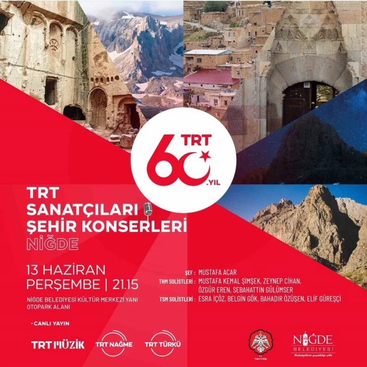TRT, milli kültürün sürdürülmesi ve gelişimine katkı sağlamak amacıyla kuruluşunun 60. yılı kapsamında, Niğde’de “TRT Sanatçıları Şehir Konseri” düzenleyecek.
