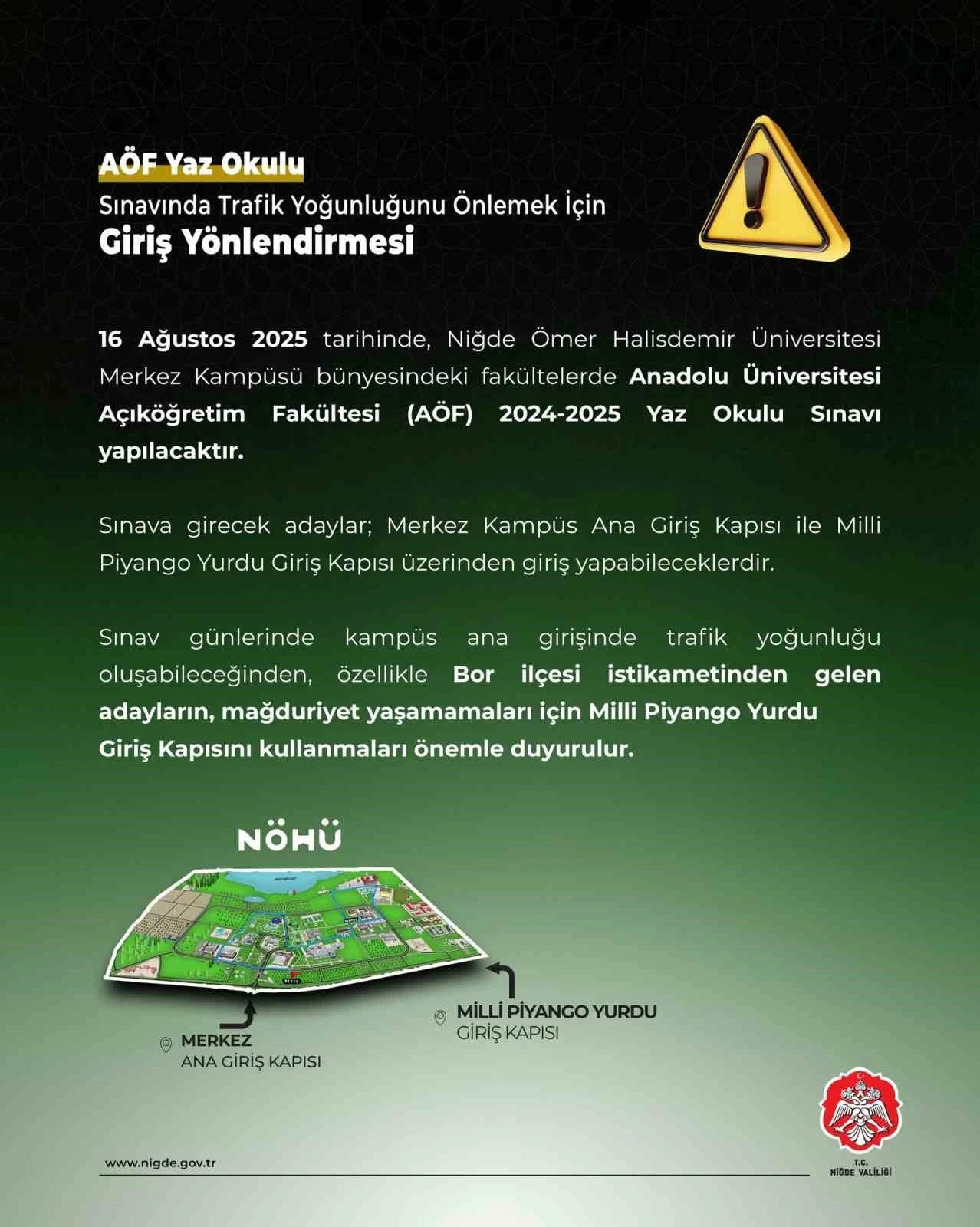 Niğde Valiliği tarafından yapılan açıklamada, sınav günlerinde adayların güvenli ve düzenli bir şekilde kampüse ulaşabilmeleri için bu yönlendirmeye uyulması istendi.