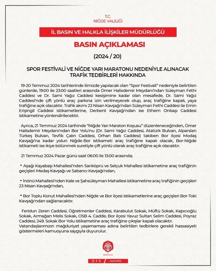 Niğde Valiliği’nden yapılan açıklamada Spor Festivali ve Niğde Yarı Maratonu nedeniyle trafik akışına kapanacak yollar ve alternatif güzergahlar açıklandı. Yapılan açıklamada, “19-20 Temmuz 2024 tarihlerinde ilimizde yapılacak olan "Spor Festivali" nedeniyle belirtilen günlerde, 19:00 ile 23:00 saatleri arasında Ömer Halisdemir Meydanı’ndan Süleyman Fethi Caddesi ve Dr. Sami Yağız Caddesine kadar olan mesafede, Dr. Sami Yağız Caddesi’nde çift yönlü araç parkına izin verilmeyecek olup, araç trafiğine kapalı, yaya trafiğine açık olacaktır. Trafik akımı 23 Nisan Kavşağı’ndan Süleyman Fethi Caddesi ile Emin Erişingil Caddesi istikametlerine, Derbent Kavşağı’ndan ise Ethem Onbaşı Caddesi istikametine yönlendirilecektir. Ayrıca, 21 Temmuz 2024 tarihinde "Niğde Yarı Maraton Koşusu” düzenleneceğinden, Ömer Halisdemir Meydanı’ndan Bor Yolu’nu (Dr. Sami Yağız Caddesi, Atatürk Bulvarı, Alparslan Türkeş Bulvarı, Tevfik Çalın Caddesi, Orhan Batı Caddesi) takiben Bor ilçesi Modaş Kavşağı’na kadar yolun Niğde-Bor istikameti araç trafiğine kapalı olacak, Bor-Niğde istikameti ise ikiye bölünmek suretiyle çift yönlü olarak araç trafiğine açık olacaktır. 21 Temmuz 2024 Pazar günü saat 06:00 ile 13:00 arasında Aşağı Kayabaşı Mahallesi’nden Sarıköprü ve Selçuk Mahallesi istikametine araç trafiğinin geçişleri Medaş Kavşağı ve Sabancı Kavşağı’ndan, İnönü Mahallesi’nden Kale ve Şahsüleyman Mahallesi istikametine araç trafiğinin geçişleri 23 Nisan Kavşağı’ndan, Bor Toplu Konut Mahallesi’nden Niğde ve Bor ilçesi istikametlerine araç geçişleri Bor-Toki Kavşağı’ndan sağlanacaktır. Feridun Zeren Caddesi, Öğretmenler Caddesi, Karabulut Sokak, Müftü Sokak, Kapıcıoğlu Sokak, Armağan Melis Sokak, OSB 4. Cadde, Bor ilçesi Yavuz Sultan Selim Caddesi, Poyraz Caddesi, 249. Sokak Bor Yolu istikametine araç trafiğine çıkışlar kapalı olacaktır. Vatandaşlarımızın mağduriyet yaşamaması adına belirtilen tedbirlere gerekli hassasiyeti göstermeleri kamuoyuna saygıyla duyurulur” ifadelerine yer verildi.