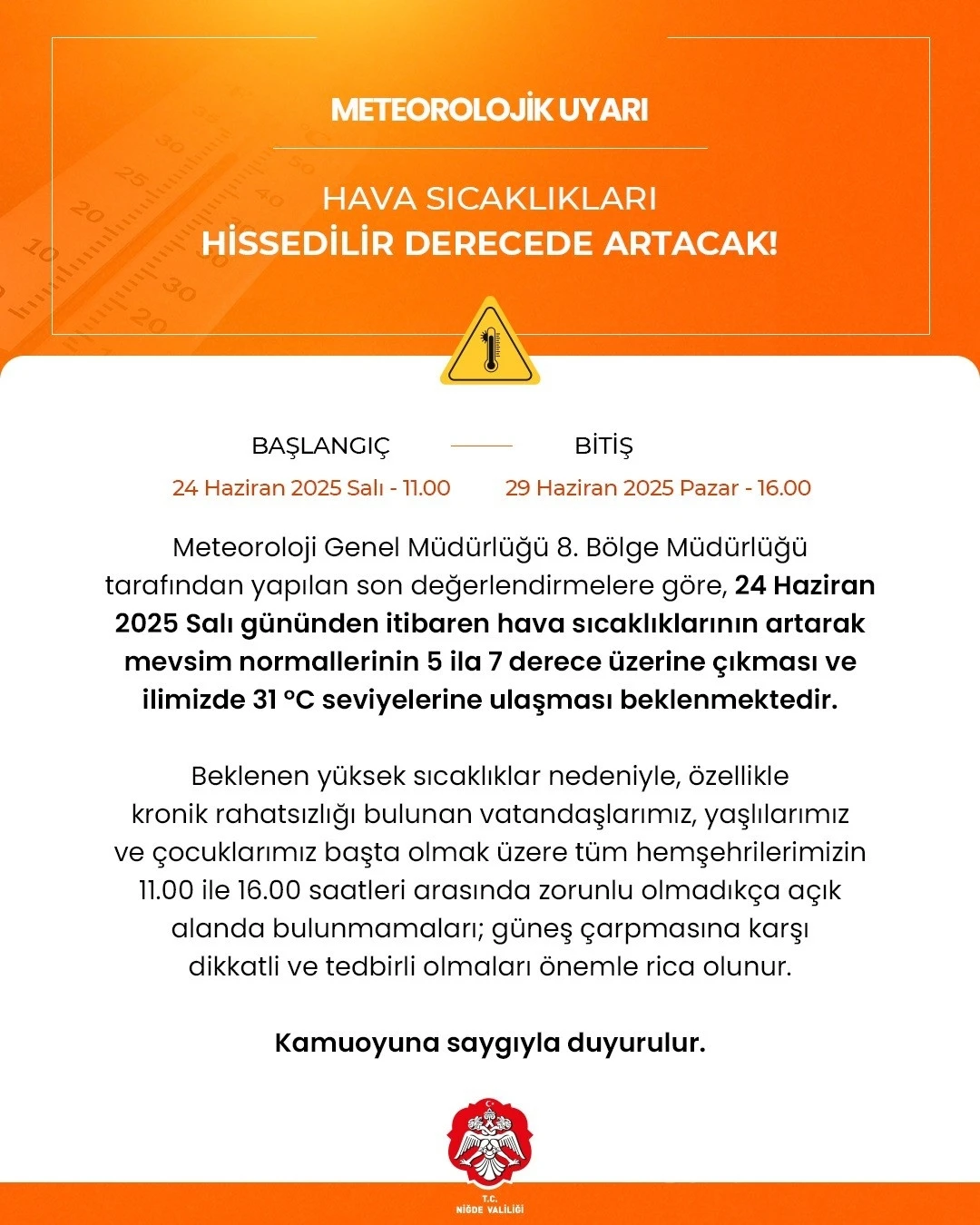 Meteoroloji Genel Müdürlüğü 8. Bölge Müdürlüğü’nün son değerlendirmelerine göre; 24 Haziran 2025 Salı günü saat 11.00 itibariyle başlayacak olan sıcak hava dalgası, 27 Haziran 2025 Pazar günü saat 16.00’ya kadar etkili olacak. Yapılan açıklamada; hava sıcaklıklarının mevsim normallerinin 5 ila 7 derece üzerine çıkarak il genelinde 31 C seviyelerine ulaşmasının beklendiği belirtildi. Niğde Valiliği tarafından yapılan duyuruda; özellikle kronik rahatsızlığı bulunan vatandaşlar, yaşlılar ve çocukların bu süreçte dikkatli olmaları istendi. Valilik; 11.00 ile 16.00 saatleri arasında zorunlu olmadıkça açık alanda bulunulmaması gerektiğini vurgulayarak, güneş çarpmasına karşı gerekli tedbirlerin alınması çağrısında bulundu.