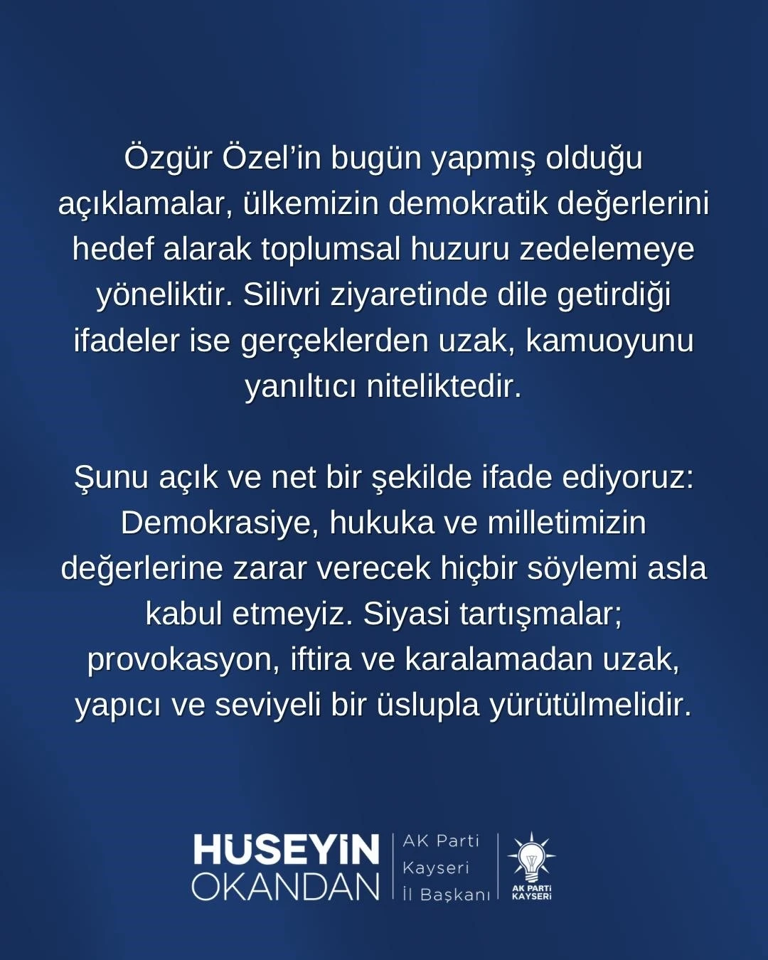 AK Parti Kayseri İl Başkanı Hüseyin Okandan, CHP Lideri Özgür Özel’in Silivri ziyaretinde yaptığı açıklamalarla alakalı sosyal medyadan açıklama yaptı. Okandan, yaptığı açıklamada Özel’in Türkiye’nin demokratik değerlerini hedef aldığını söyledi. Özel’in açıklamalarının toplumsal huzuru bozmaya yönelik olduğunu dile getiren Okandan’ın paylaşımı şu şekilde: