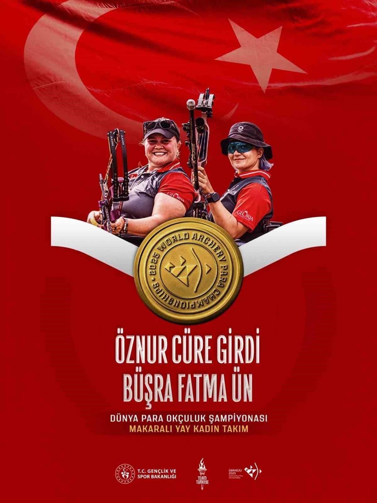 Güney Kore’de düzenlenen Dünya Para Okçuluk Şampiyonası’nda Öznur Cüre Girdi ve Büşra Fatma Ün’den oluşan Makaralı Yay Kadın Takımı, finalde Hindistan ile karşılaştı. Milliler, 152-148’lik sonuçla altın madalyaya uzandı ve dünya şampiyonu oldu.