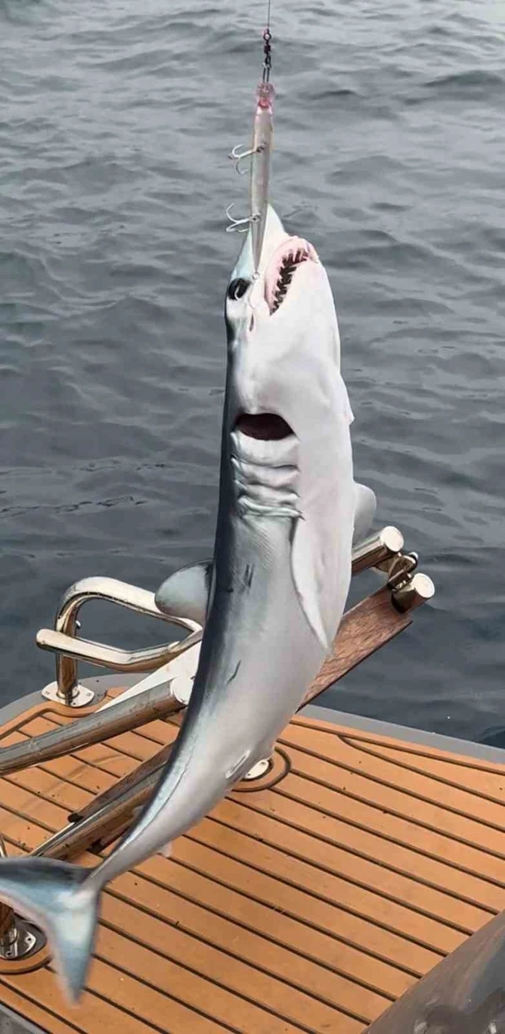 Mersin’de çıktığı motoryat gezisinde amatörce balık avlayan Mehmet Ural’ın oltasına yaklaşık 70 santimetrelik yavru köpekbalığı takıldı. Tekneye çıkarılmaya çalışılan köpek balığı oltadan kurtulup kaçarken, o anlar cep telefonu ile görüntülendi.