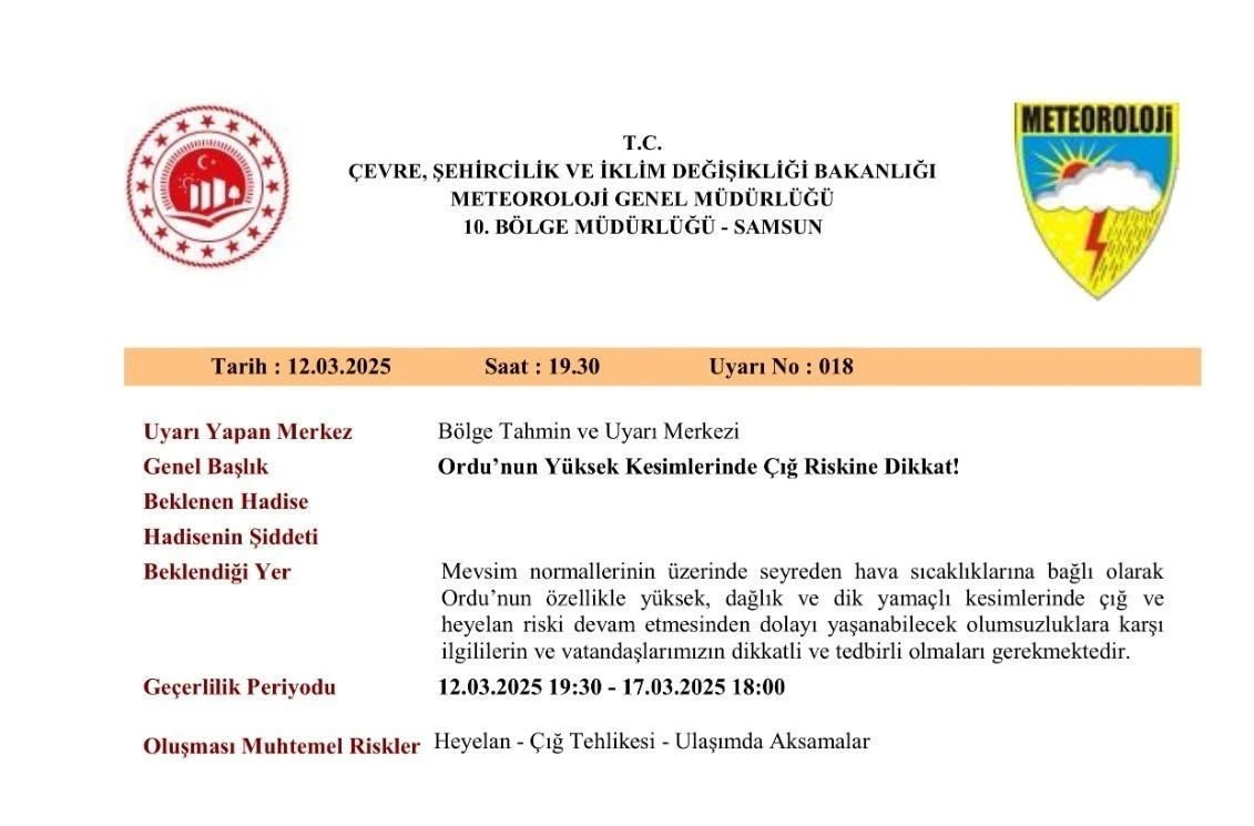 Meteoroloji 10. Bölge Müdürlüğünden yapılan uyarıda, mevsim normallerinin üzerinde seyreden hava sıcaklıklarına bağlı olarak Ordu’nun özellikle yüksek, dağlık ve dik yamaçlı kesimlerinde 12-17 Mart tarihleri arasında çığ ve heyelan riski devam ettiğine dikkat çekildi. Uyarıda, yaşanması muhtemel olumsuzluklara karşı ilgililerin ve vatandaşların dikkatli ve tedbirli olmaları gerektiği belirtildi.