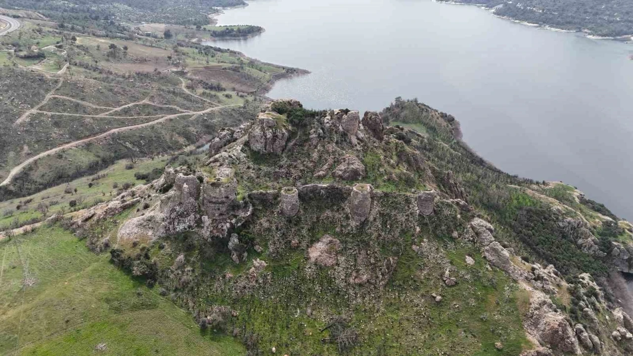 Çanakkale’de Roma dönemine ait 2 bin 500 yıllık geçmişe sahip Atikhisar Kalesi, 2 yıl önce 4 bin 80 hektar alanın küle döndüğü orman yangınlarında siyaha büründü. Yeşil örtüyle kaplanmaya başlayan Atikhisar Kalesi dron ile görüntülendi.