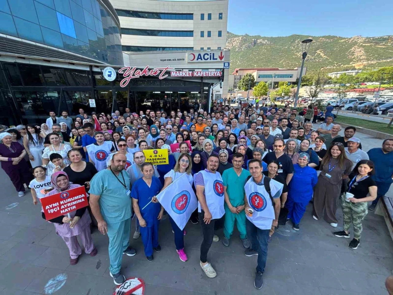 Denizli Pamukkale Üniversitesi (PAÜ) Hastanesinde görevli bir grup sağlık çalışanı, eşit çalışma şartları ve eşit ücret talebiyle 2 saatliğine 2’inci kez iş bırakma eylemi gerçekleştirdi.