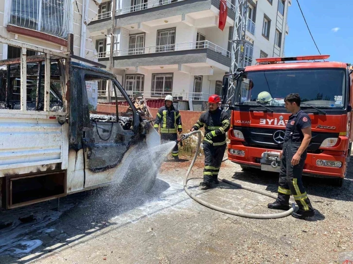 Hatay’da park halindeyken yanmaya başlayan kamyonette maddi hasar oluştu.
