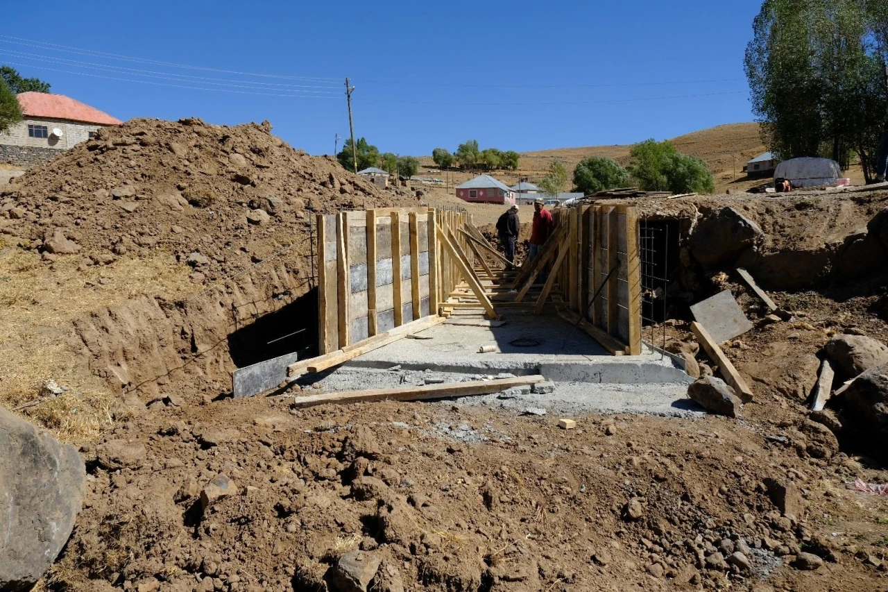 Ağrı’nın Patnos ilçesine bağlı Gündüz Köyü’nde, köy yolunun altyapısını güçlendirmek ve yağış sularının düzenli tahliyesini sağlamak amacıyla menfez yapım çalışmaları devam ediyor.