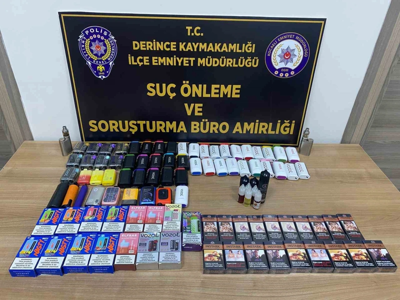 Kocaeli İl Emniyet Müdürlüğünce kaçakçılık faaliyetlerinin men ve takibine yönelik çalışma başlatıldı. Yapılan çalışmalar neticesinde bugün Derince ilçesi Yenikent Mahallesi’ndeki kapalı pazarda yapılan kontrollerde 73 elektronik sigara, gümrük kaçağı 19 sigara, elektronik sigara dolumunda kullanılan 8 likit ele geçirildi. Malzemelere el konurken, pazar tezgahının sahibine 5607 SKM suçundan adli işlem yapıldı.