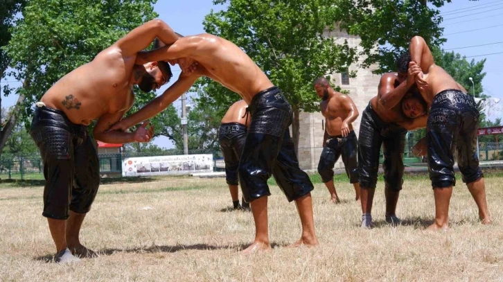 Edirneli pehlivanlar, 663. Tarihi Kırkpınar Yağlı Güreşleri’ne hazırlık için 40 derece sıcaklığa rağmen kispet bağlayıp çayıra çıktı. Koşu ve ısınma hareketlerinin ardından birbirleriyle eşleşip sıcak hava altında güreş tutan pehlivanlar, şimdiden nefes kesti.