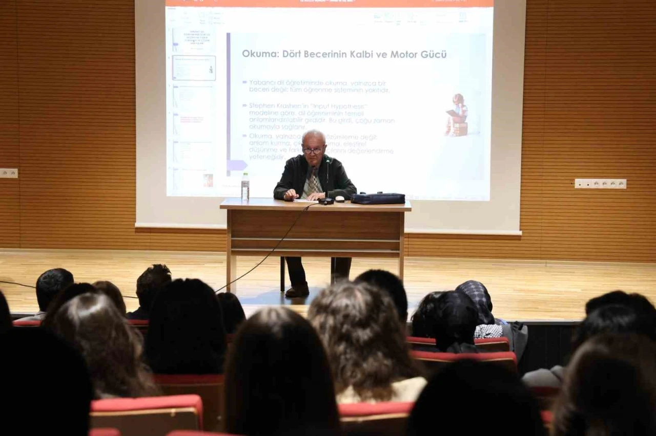 Sağlık Bilimleri Fakültesi Konferans Salonu’nda programa; Düzce Üniversitesi Hakime Erciyas Yabancı Diller Yüksekokul Müdürü Dr. Öğr. Üyesi Osman Dülger, akademisyenler ve öğrenciler katılım sağlarken, Hacettepe Üniversitesi Yabancı Diller Eğitimi Bölümü Emekli Öğretim Üyesi Prof. Dr. Cengiz Tosun konuşmacı olarak etkinlikte yer aldı.