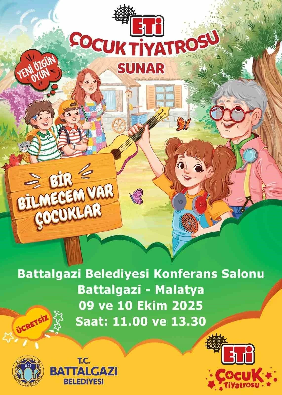 Battalgazi Belediyesi, çocukların dijital bağımlılıktan uzaklaşması, özgüvenlerini geliştirmesi ve keyifli vakit geçirmelerini sağlamak amacıyla "Eti Çocuk Tiyatrosu"nu Battalgazili miniklerle buluşturuyor. "Bir Bilmecem Var Çocuklar" adlı tiyatro oyunu, 9-10 Ekim tarihlerinde Battalgazi Belediyesi Konferans Salonu’nda ücretsiz olarak sahnelenecek.