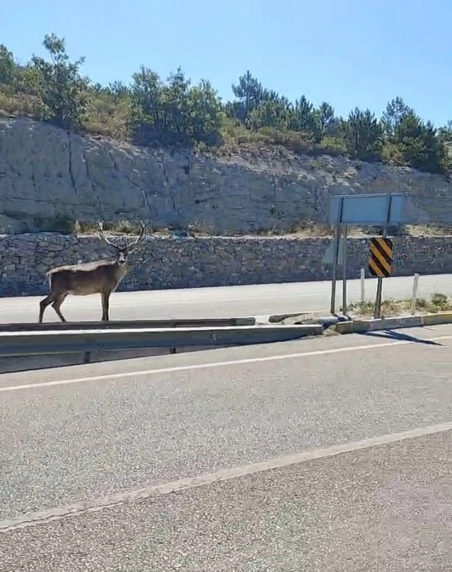 Afyonkarahisar-Ankara kara yolunda ilerleyen sürücüler refüjde koşan geyiği görünce hayrete düştü.
