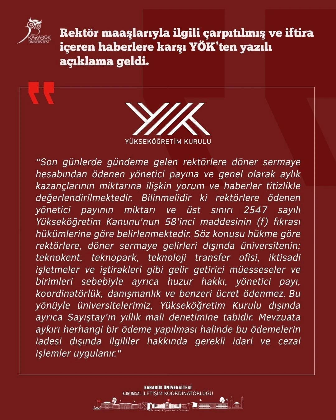 Karabük Üniversitesi Rektörü Prof. Dr. Fatih Kırışık’ın döner sermaye gelirleriyle birlikte aylık maaşının 1.2 milyon lirayı bulduğu iddiasının ardından YÖK’ten ve iddiaların hedefindeki Karabük Üniversitesi’nden peş peşe açıklama geldi.
