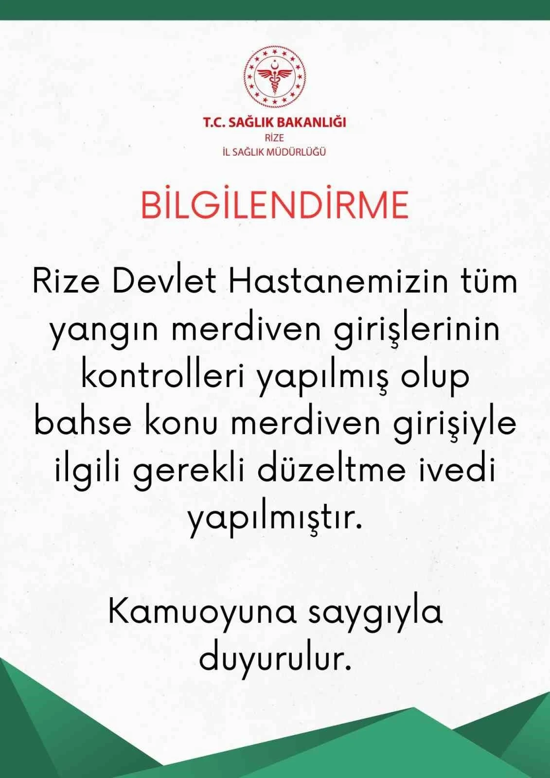 Bolu Kartalkaya’da 76 kişinin vefatı ile sonuçlanan yangının ardından tüm ülkede gözler yangın için alınan tedbirlere çevrilirken Rize Devlet Hastanesi’nin yangın merdivenlerinin girişlerinin vatandaşlar sigara içiyor iddiası ile başhekimlik tarafından kablo kanalları vidalanarak kapatılması tepkilere neden olmuştu. Yapılan haberlerin ardından harekete geçen Rize İl Sağlık Müdürlüğü, yangın merdiveni kapılarının kontrol edildiğini, gereken önlemlerin ivedilikle alındığını dile getirdi. Rize İl Sağlık Müdürlüğü’nden yapılan açıklamada “Rize Devlet Hastanemizin tüm yangın merdiven girişlerinin kontrolleri yapılmış olup bahse konu merdiven girişiyle ilgili gerekli düzeltme ivedi yapılmıştır. Kamuoyuna saygıyla duyurulur” ifadelerine yer verildi.