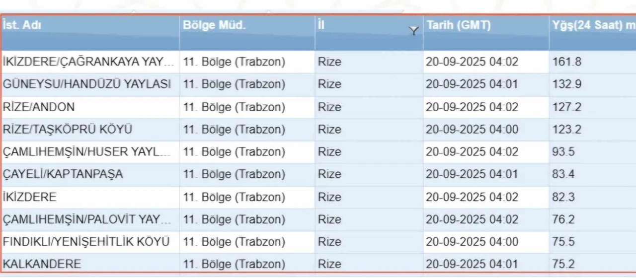 Rize İl Afet ve Acil Durum Müdürlüğü’nden alınan bilgiye göre, Rize’nin bir çok noktasına son 24 saatte 75 kg ve üstü yağış düşerken, en fazla yağış 161 kg ile İkizdere ilçesi Çağrankaya Yaylası’na düştü. Ardından en fazla yağış sırasıyla Güneysu-Handüzü Yaylası 132.9 kg ve Andon 127 kg olarak kayıtlara geçti.
