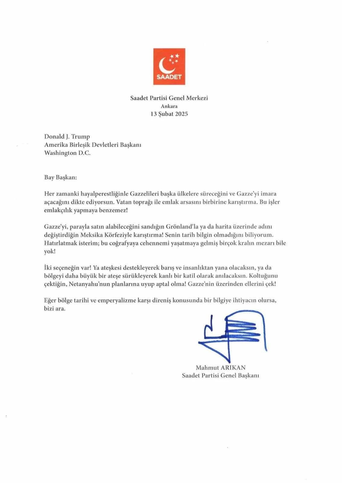 Saadet Partisi Genel Başkanı Mahmut Arıkan, Filistinlileri Gazze’den çıkarma planları yapan ve Gazze’yi cehenneme çevireceğini iddia eden ABD Başkanı Donald Trump’a mektup yazdı.