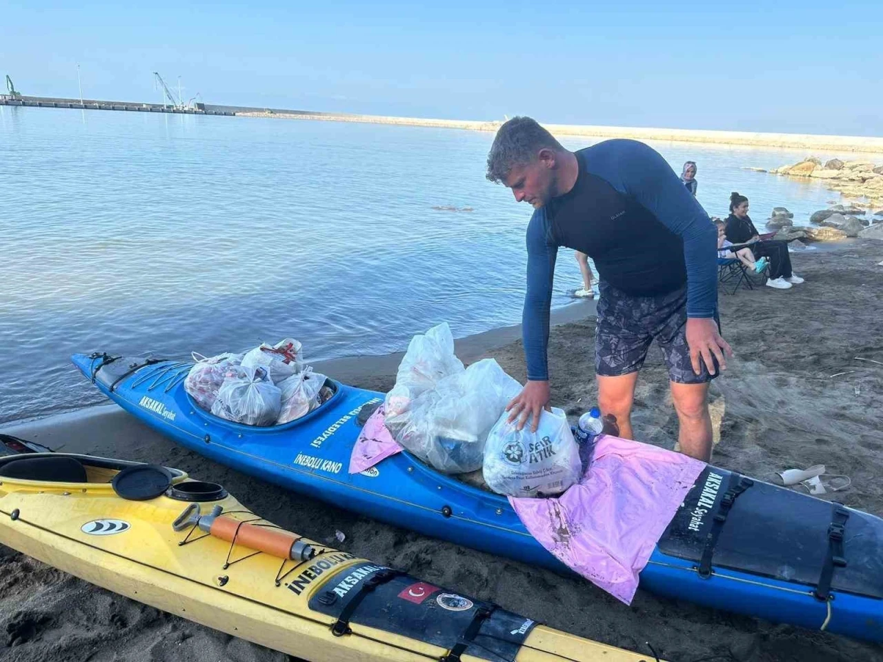 Kastamonu’nun İnebolu ilçesinde bir sporcu, sahile atılan çöpleri tek tek toplayarak kanosuyla taşıdı.