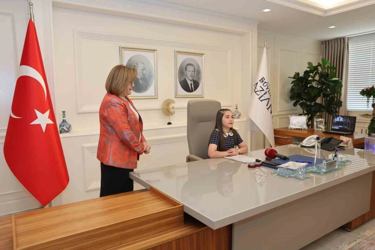 Gaziantep Büyükşehir Belediye Başkanı Fatma Şahin, 23 Nisan Ulusal Egemenlik ve Çocuk Bayramı dolayısıyla koltuğunu minik Azra’ya devretti.