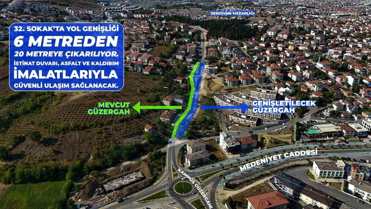 Yapılan açıklamada, "Şehrin ulaşım altyapısını güçlendirmek, yeni alternatif yollar ile vatandaşlarımızın hayatını kolaylaştırmak için aralıksız çalışıyoruz. Serdivan Mezarlığı ve Medeniyet Caddesi arasında önemli trafik yüküne sahip 32. Sokak’taki 6 metrelik yol genişliğini 20 metreye çıkarıyoruz. Çalışmalarımız tamamlandığında Mavi Durak bölgesindeki trafik yükü büyük ölçüde rahatlayacak" ifadelerine yer verildi.