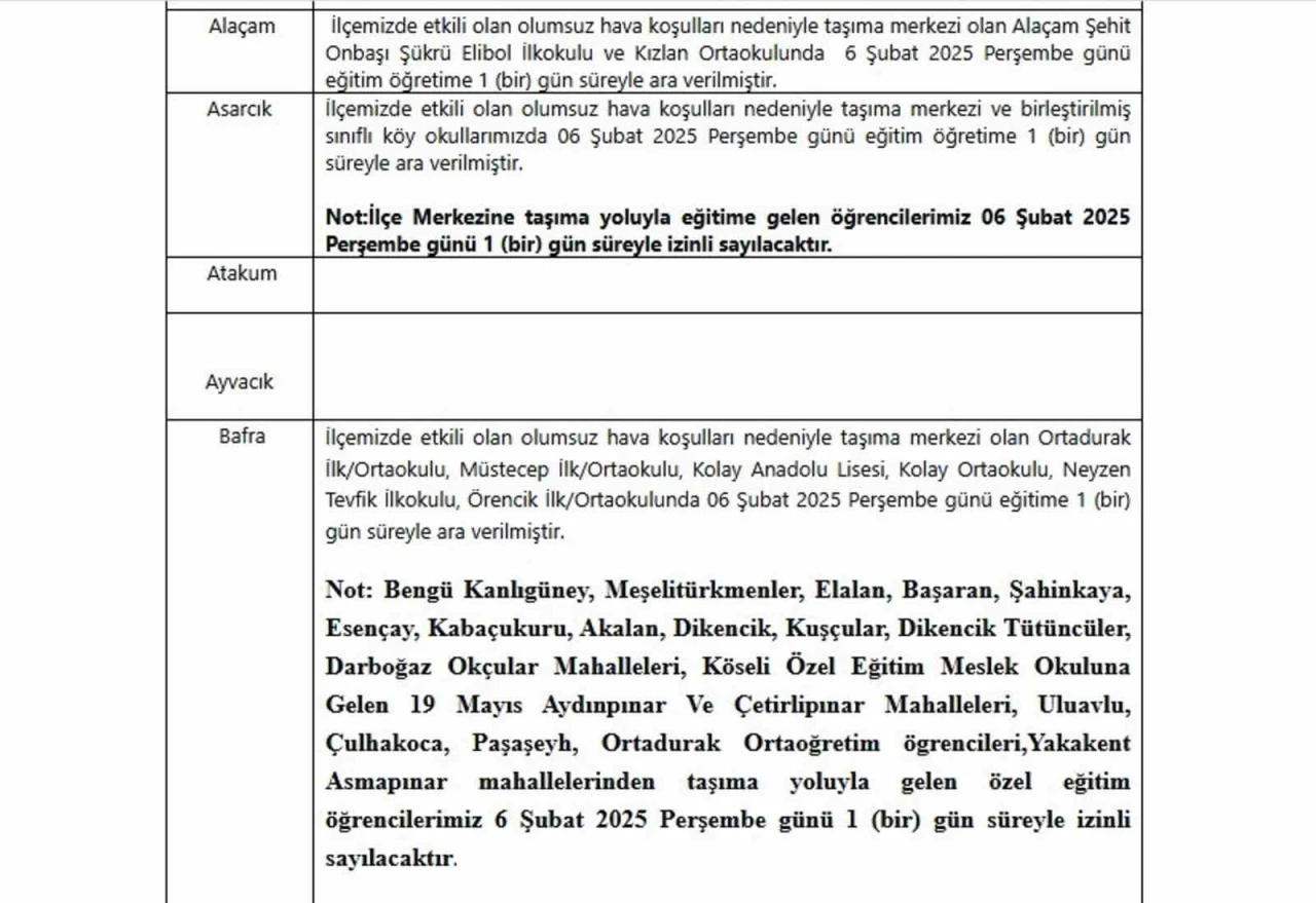 Bafra için, "İlçemizde etkili olan olumsuz hava koşulları nedeniyle taşıma merkezi olan Ortadurak İlk/Ortaokulu, Müstecep İlk/Ortaokulu, Kolay Anadolu Lisesi, Kolay Ortaokulu, Neyzen Tevfik İlkokulu, Örencik İlk/Ortaokulunda Perşembe günü eğitime 1 gün süreyle ara verilmiştir. Not: Bengü Kanlıgüney, Meşelitürkmenler, Elalan, Başaran, Şahinkaya, Esençay, Kabaçukuru, Akalan, Dikencik, Kuşçular, Dikencik Tütüncüler, Darboğaz Okçular Mahalleleri, Köseli Özel Eğitim Meslek Okuluna Gelen 19 Mayıs Aydınpınar Ve Çetirlipınar Mahalleleri, Uluavlu, Çulhakoca, Paşaşeyh, Ortadurak Ortaoğretim ögrencileri, Yakakent Asmapınar mahallelerinden taşıma yoluyla gelen özel eğitim öğrencilerimiz 6 Şubat Perşembe günü 1 gün süreyle izinli sayılacaktır."