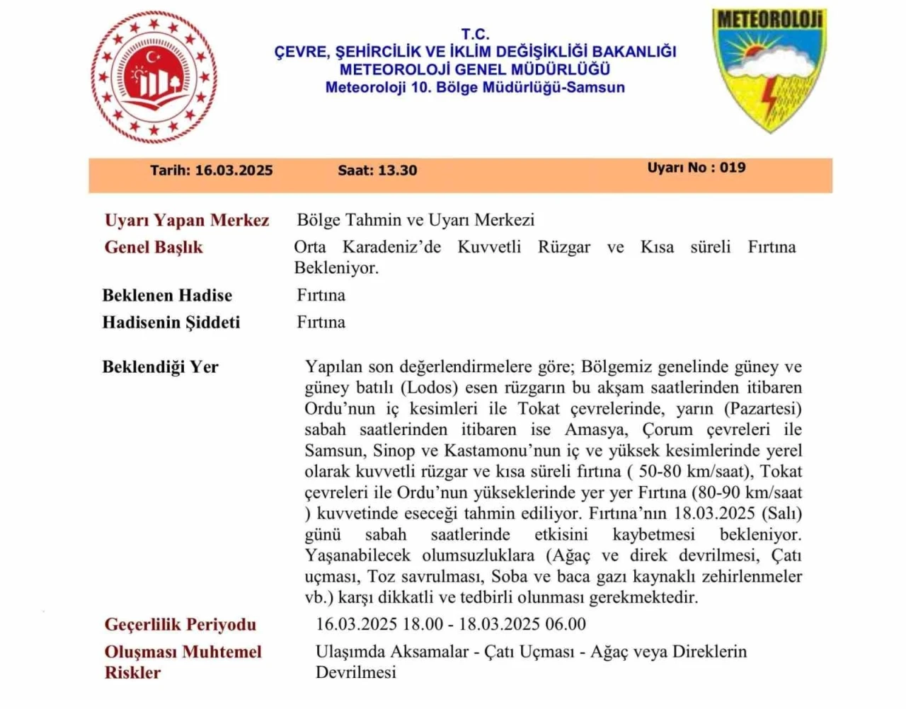 Bölge Tahmin ve Uyarı Merkezi’nden yapılan Orta Karadeniz’de kuvvetli rüzgar ve kısa süreli fırtına başlıklı bilgilendirmede, "Yapılan son değerlendirmelere göre; bölgemiz genelinde güney ve güney batılı (Lodos) esen rüzgarın bu akşam saatlerinden itibaren Ordu’nun iç kesimleri ile Tokat çevrelerinde, yarın sabah saatlerinden itibaren ise Amasya, Çorum çevreleri ile Samsun, Sinop ve Kastamonu’nun iç ve yüksek kesimlerinde yerel olarak kuvvetli rüzgar ve kısa süreli fırtına (50-80 km/saat), Tokat çevreleri ile Ordu’nun yükseklerinde yer yer fırtına (80-90 km/saat) kuvvetinde eseceği tahmin ediliyor. Fırtınanın Salı günü sabah saatlerinde etkisini kaybetmesi bekleniyor. Yaşanabilecek olumsuzluklara (Ağaç ve direk devrilmesi, çatı uçması, toz savrulması, soba ve baca gazı kaynaklı zehirlenmeler gibi) karşı dikkatli ve tedbirli olunması gerekmektedir" ifadeleri kullanıldı.