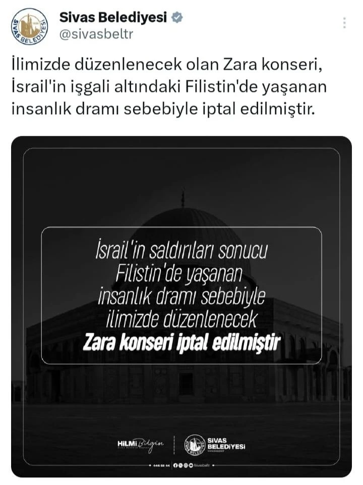 Sivas Belediyesi’nin sosyal medya hesaplarından yapılan açıklamada, “İsrail’in saldırıları sonucu Filistin’de yaşanan insanlık dramı sebebiyle ilimizde düzenlenecek olan Zara konseri iptal edilmiştir” ifadelerine yer verildi.