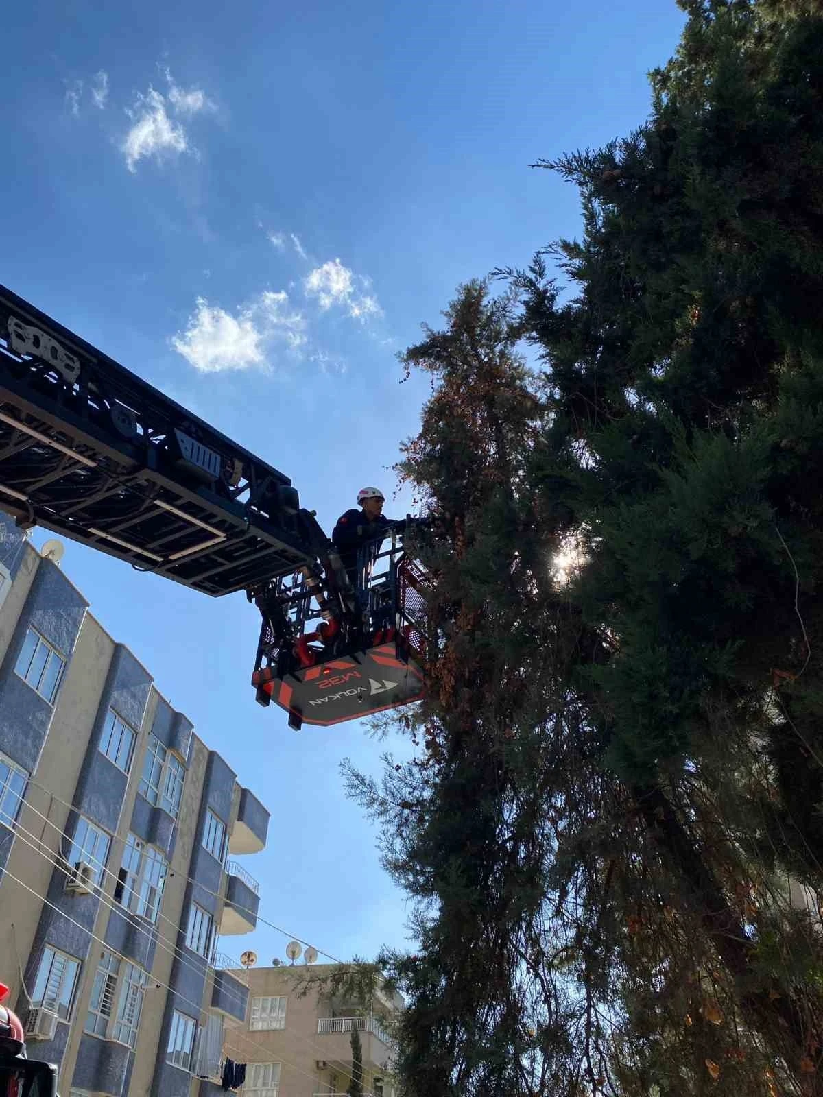 Şanlıurfa’da ağaçta mahsur kalan yavru kedi, duyarlı öğretmenin ihbarıyla itfaiye ekipleri tarafından kurtarıldı.