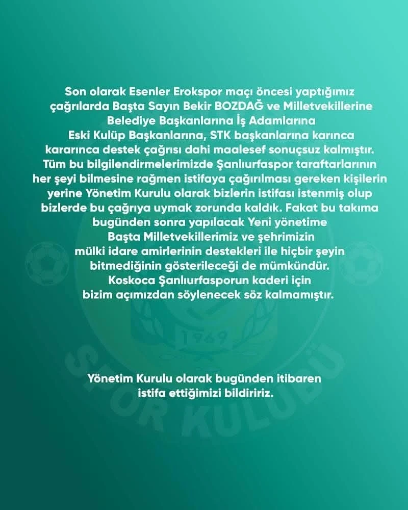 Koskoca Şanlıurfaspor için bizim açımızdan söylenecek söz kalmamıştır. Yönetim kurulu olarak bugünden itibaren istifa ettiğimizi bildiririz" ifadelerine yer verildi.
