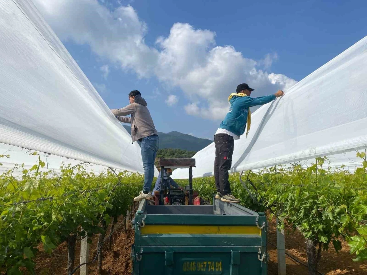 Manisa’nın Sarıgöl ilçesinde ve bölgedeki üzüm bağlarına 10-12 Nisan tarihleri arasında zarar veren zirai don afetinin ardından zarar görmeyen üzüm bağlarında üreticiler yüksek maliyetli olmasına rağmen dolu tülü sistemle bağlarının üstünü örme çalışmalarına hız verdi.