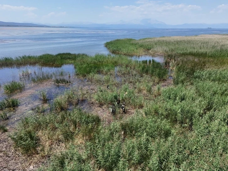 Türkiye’nin en büyük tatlı su gölü olan Beyşehir Gölü’nün sazlıklarla kaplanan adeta bataklığa dönüşen kıyılarında otlayan büyükbaş hayvanlar suda serinliyor.