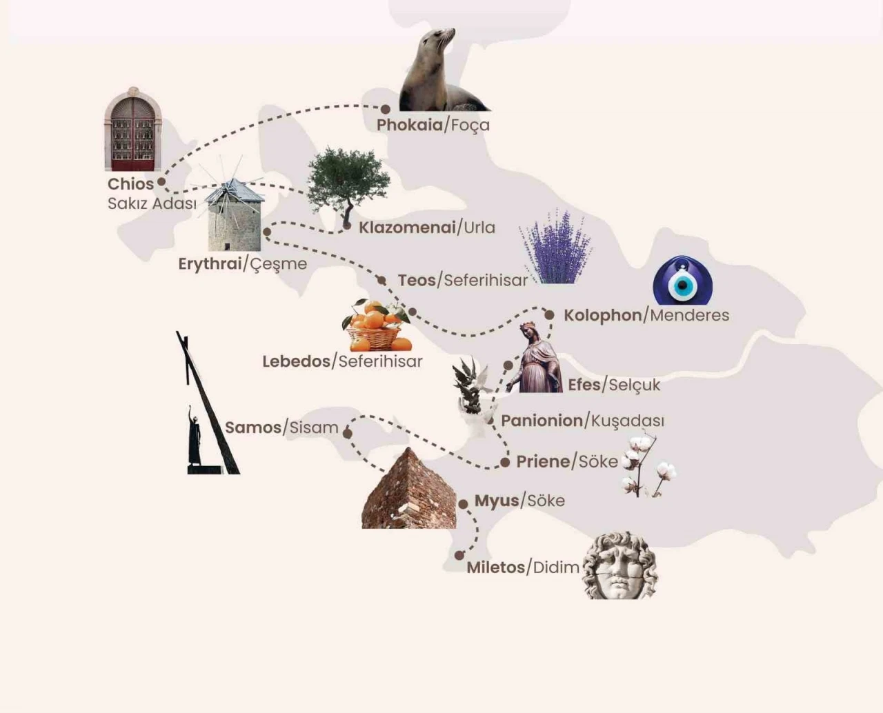 Ephesos (Efes), Teos (Seferihisar), Kolophon (Menderes), Klazomenai (Urla), Phokaia (Foça), Lebedos (Seferihisar), Priene (Söke), Miletos (Milet), Myus (Söke), Didyma (Didim) ve Chios (Sakız Adası), Samos ve Paninion (Kuşadası) şehirlerinden oluşan İon Rotası, Ege’nin en önemli antik yerleşimlerinden olan İonia şehirlerinin geçmişini bugünün değerleriyle buluşturuyor. Seferihisar Belediyesinin öncülüğünde, tarihi ve kültürel turizmi geliştirme amacıyla hazırlanan proje, bölgedeki arkeolojik alanlara dikkat çekerek yerel ve uluslararası turistlerin ilgisini çekiyor. İon Rotası ile turizmde yeni bir soluk