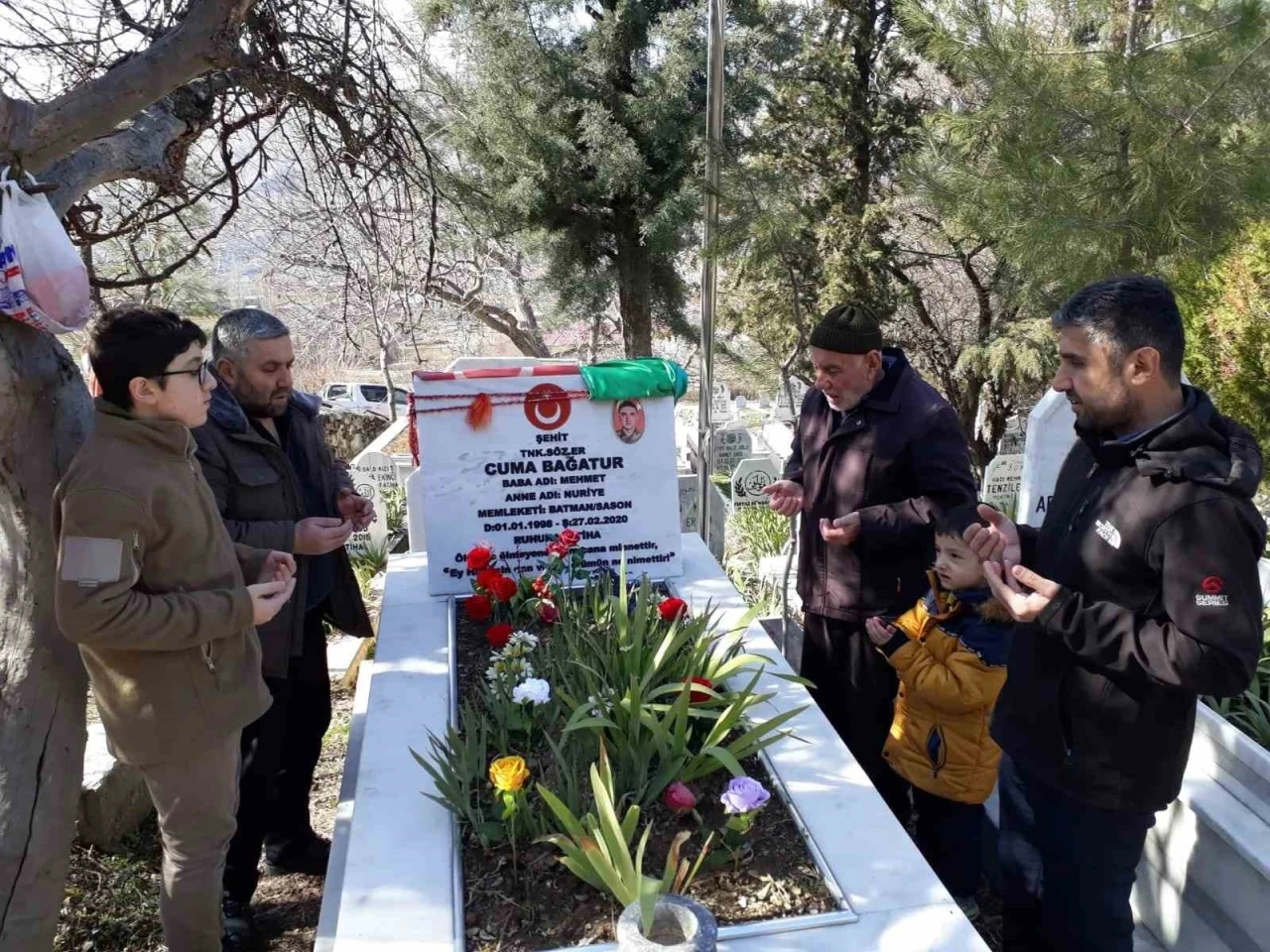 İdlib’de 27 Şubat 2020 tarihinde Esad rejimi unsurlarının hava saldırısı sonucu şehit olan Sözleşmeli Er Cuma Bağatur, Batman’ın Sason ilçesinde mezarı başında dualarla anıldı.